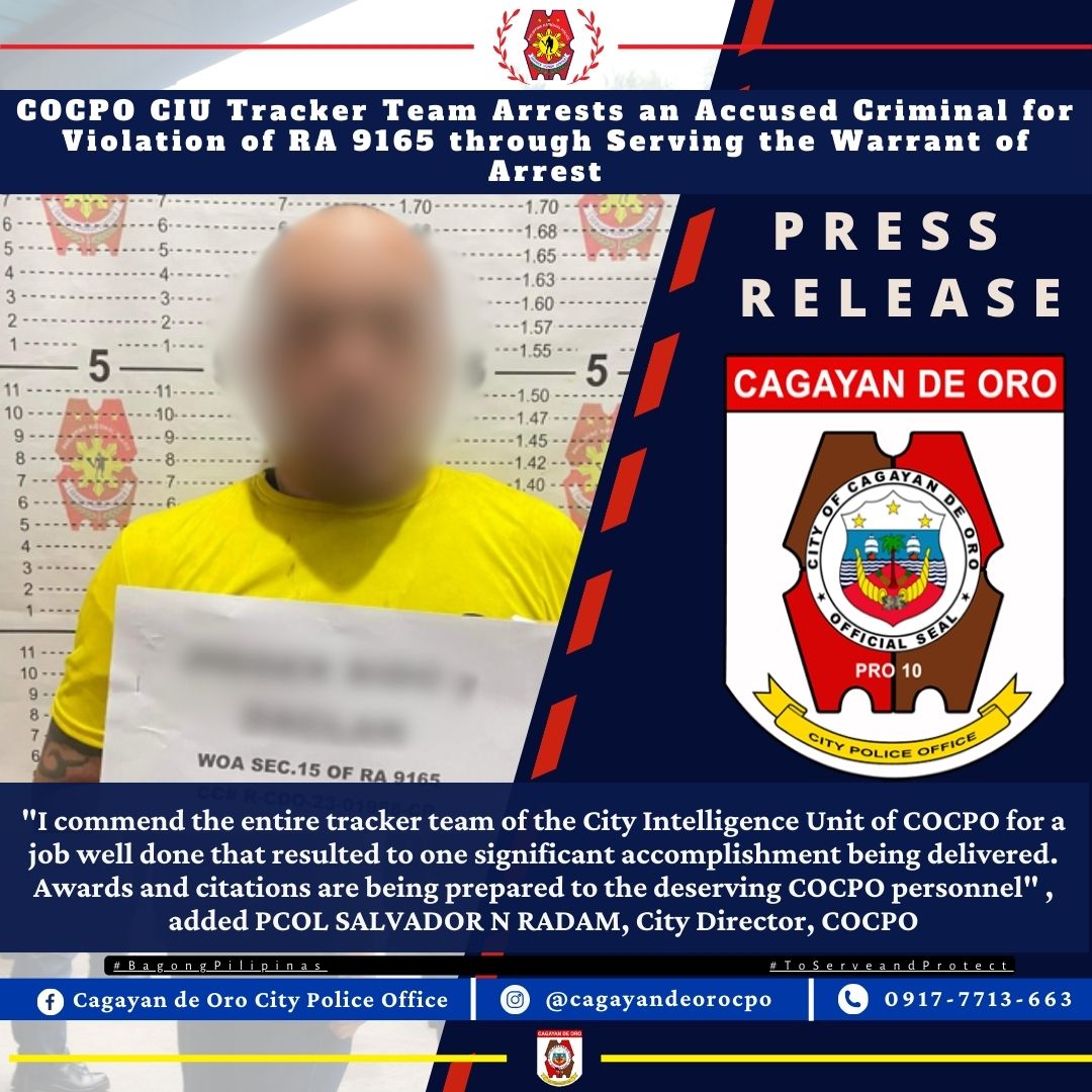 In a report made by Police Colonel Radam to Police Brigadier General RICARDO G LAYUG JR., Regional Director of Police Regional Office 10 has stated that on or about 10:45 AM of April 17, 2024. Tracker Team of City Intelligence Unit (CIU) COCPO led by Police Captain JUNE PAULETTE J DOCALLOS, (Team leader) under direct supervision of Police Lieutenant Colonel GIL MANALO AGPAOA, Chief CIU conducted intel driven operation at Brgy Macasandig, Cagayan de Oro City that resulted to the successful serving the Warrant of Arrest against the accused for the Violation of RA 9165 Sec 15 with Criminal Case No. R-CDO-23-01988-CR dated April 11, 2024 issued by HON. ARTHUR L ABUNDIENTE, Presiding Judge, Br 25 RTC 10, CDO. The said operation was covered by Alternative Recording Device (ARD) as required.