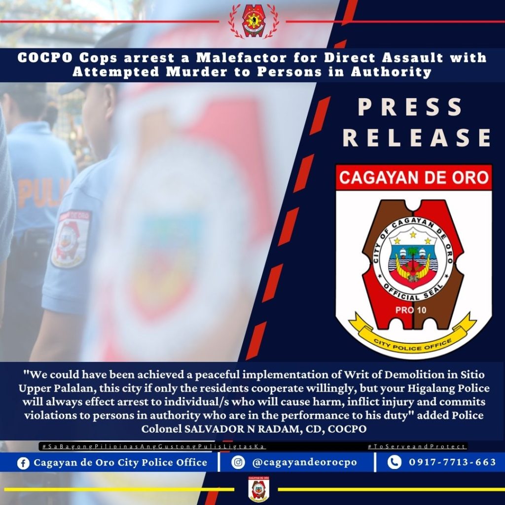 COCPO, Cagayan de Oro City- Police Colonel SALVADOR NOMIO RADAM, City Director of COCPO marks the swift response of Police Station 8 Lumbia upon taking arrests of suspect a certain XXXXX XXXXXXX XXXXX, 28 years old, single, resident of Upper Palalan, Lumbia, CDOC for Direct Assault with Attempted Murder in Connection with Writ of Demolition in Civil Case No. C18-NOV-117 dated June 4, 2024 at 11:30 AM that transpired at Upper Palalan, Brgy. Lumbia, Cagayan de Oro City.
