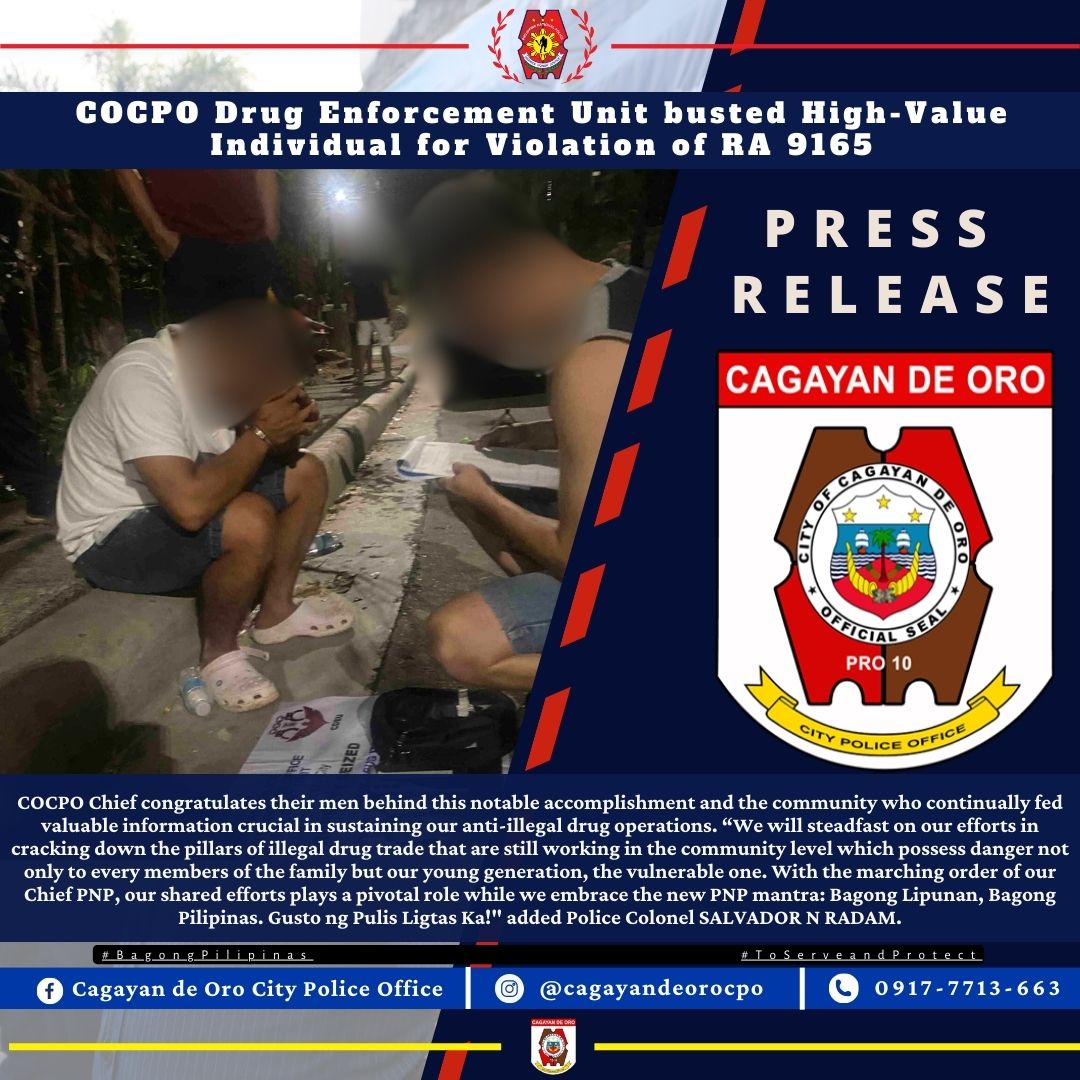 Cagayan de Oro City – Police Colonel SALVADOR N RADAM, City Director of Cagayan de Oro City Police office (COCPO) lauds the significant accomplishment delivered by the City Drug Enforcement Unit Operatives-COCPO (CDEU-COCPO) during drug buy-bust operations that resulted to the arrest of High-Value Individuals for violation of R.A 9165 and confiscation of a total weight of 63 grams shabu with market value of Php 428, 400.00 at around 3:40 AM of May 6, 2024 transpired in Taguanao, Brgy. Indahag, Cagayan de Oro City.