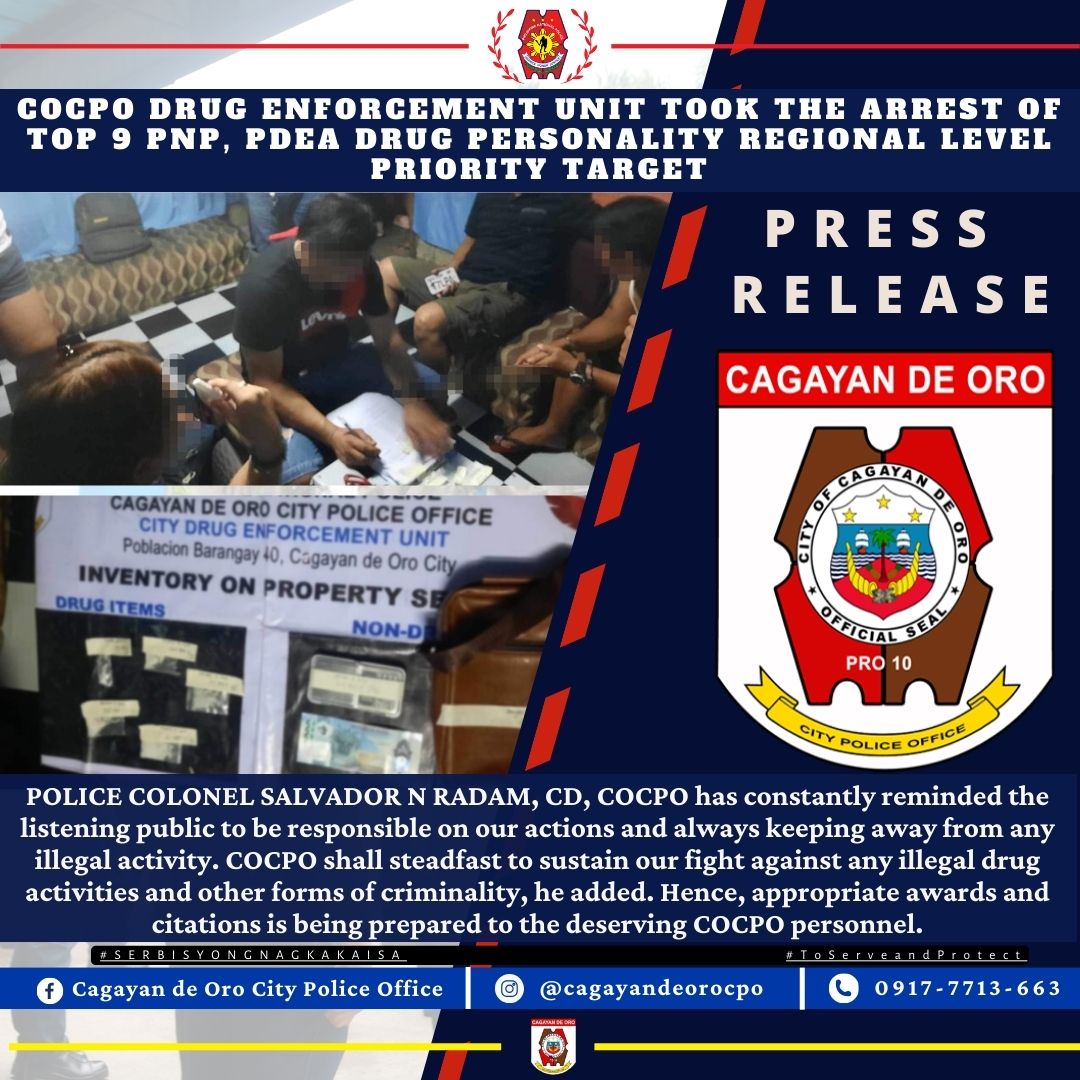 Based on the report of PCOL Radam, City Director to higher headquarters of Police Regional Office 10 under the command of Police Brigadier General RICARDO G LAYUG JR., Regional Director, PRO 10, that a Buy-bust operation was conducted at the aforementioned date, time and place by City Drug Enforcement Unit led by Police Major ALDREN ESTRADA BACULIO, Chief-CDEU, together with City Intelligence Unit-COCPO in coordination with PDEA 10 under Pre-ops number 30002-012024-0086 which resulted in the arrest of the above-mentioned suspect and recovery of worth Php1000 buy-bust money and confiscation of 5 sachets of suspected shabu with total estimated weight of 15 grams and street value of Php 102,000.00 in Violation of R.A. 9165.
