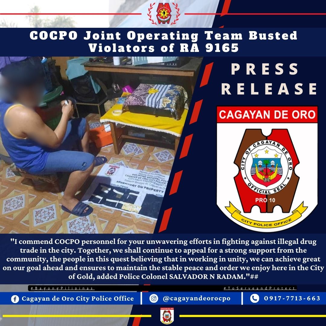 Cagayan de Oro City- Elements of Cagayan de Oro City Police Office (COCPO), City Drug Enforcement Unit together with the City Intelligence Unit successfully arrested violators of R.A. 9165 during the conduct of drug buy-bust operation in coordination under PDEA-10 pre-ops number 30002-052024-0489.