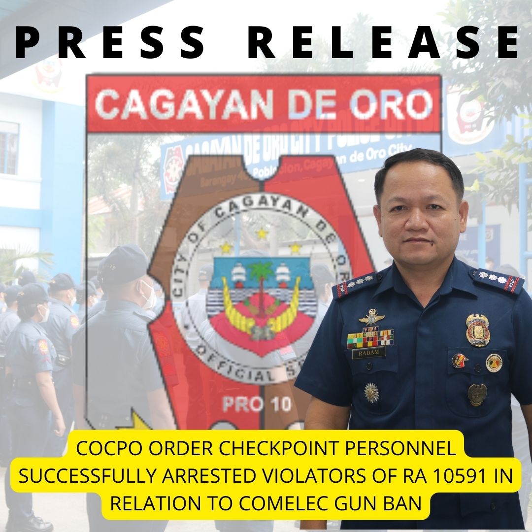 Cagayan de Oro City – Police Colonel Salvador N RADAM, Officer-In-Charge of COCPO has made an appeal to the general public to be a responsible gun owners and observe existing laws, particularly on RA 10591 in relation to the Comelec gun ban. This was in relation to the recent arrest of certain E**es*o A. A*o*a** (Security Guard), married, 36 y. o, a resident of Santiago, Agusan del Norte that transpired on September 18, 2023, at 1:35 PM at Zone 4, Brgy. Bugo Border Check Point (BCP), Cagayan de Oro City.